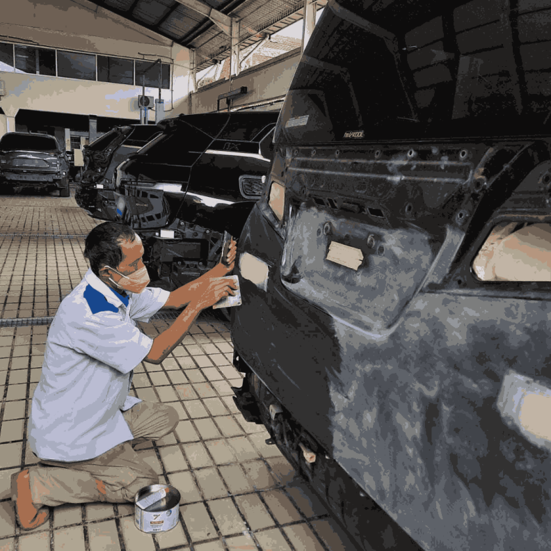 Kami mengisi bagian yang belum rata dengan dempul berkualitas. Tahap ini penting untuk meratakan permukaan badan, sehingga pengecatan dapat menghasilkan hasil akhir yang halus dan sempurna.