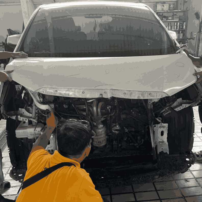 Kami melakukan proses pembongkaran bagian mobil agar perbaikan dan pengecatan dapat dilakukan secara menyeluruh, dengan hasil rapi tanpa mengenai bagian yang tidak perlu dicat.