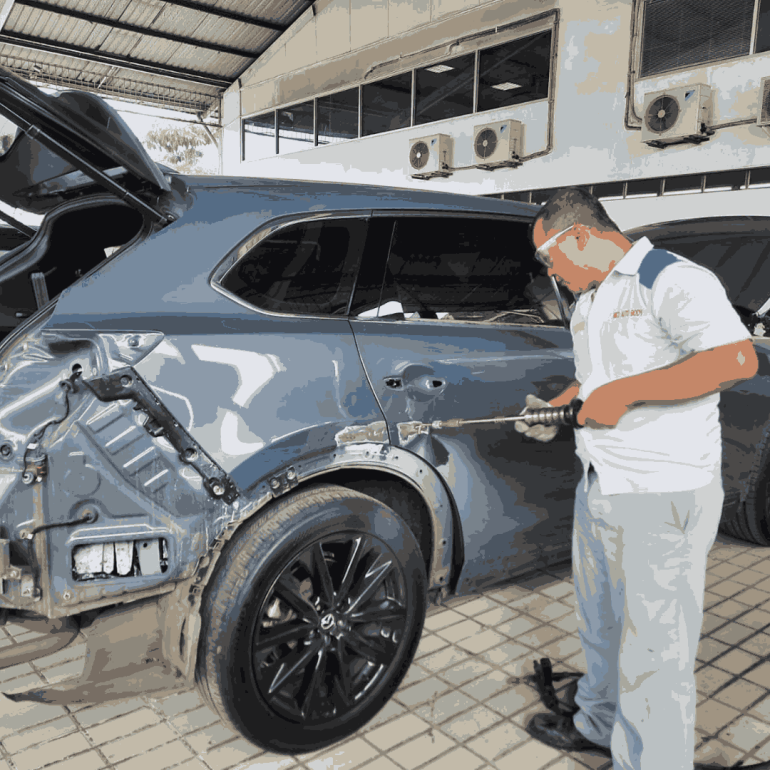 Kami memperbaiki bagian badan mobil. Proses ketok dilakukan secara manual atau menggunakan alat bantu khusus agar panel kembali ke bentuk semula sebelum masuk ke tahap pendempulan.